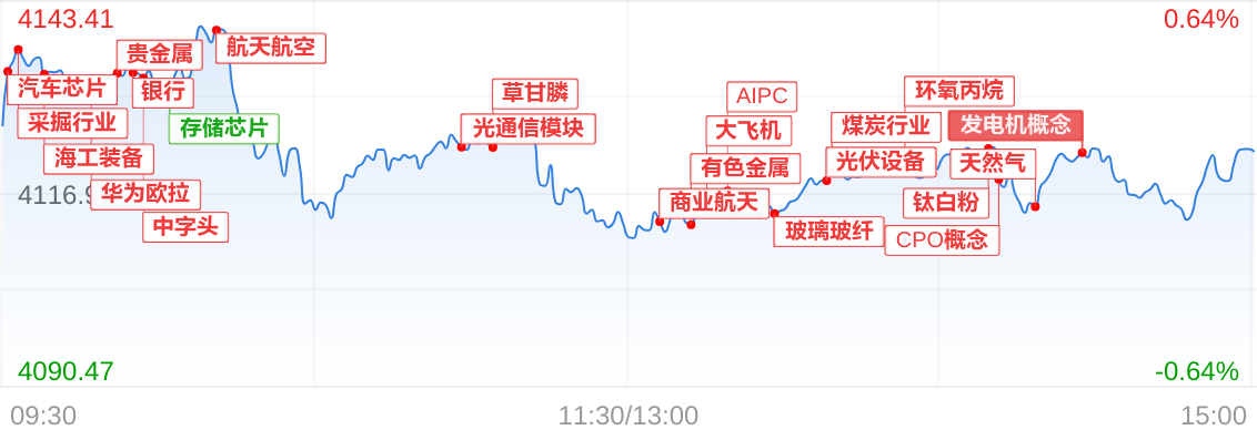 A股三大指数中创业板指领涨,截至收盘,上证指数上涨0.14%,深证成指上涨0.50%,创业板指上涨1.01%,北证50指数上涨0.69%。沪深两市成交额26917.33亿元,较上个交易日放量910.32亿。全市场3577只个股上涨。板块题材上,油气设服、氦气概念、VPN板块涨幅居前,高带宽内存、第四代半导体、Chiplet概念板块跌幅居前。大盘表现