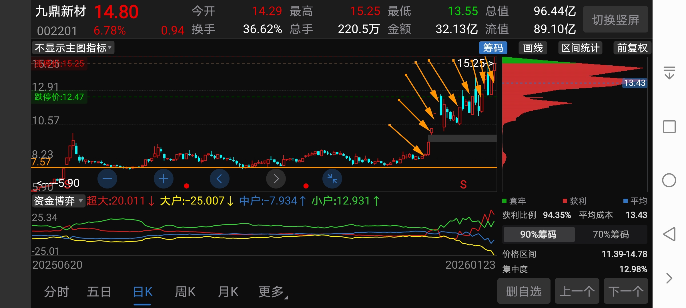 $九鼎新材(SZ002201)$ 这半年多一点12次涨停,7月初3次涨停以来,经过长期几个月震荡整理,目前又出现9次涨停。