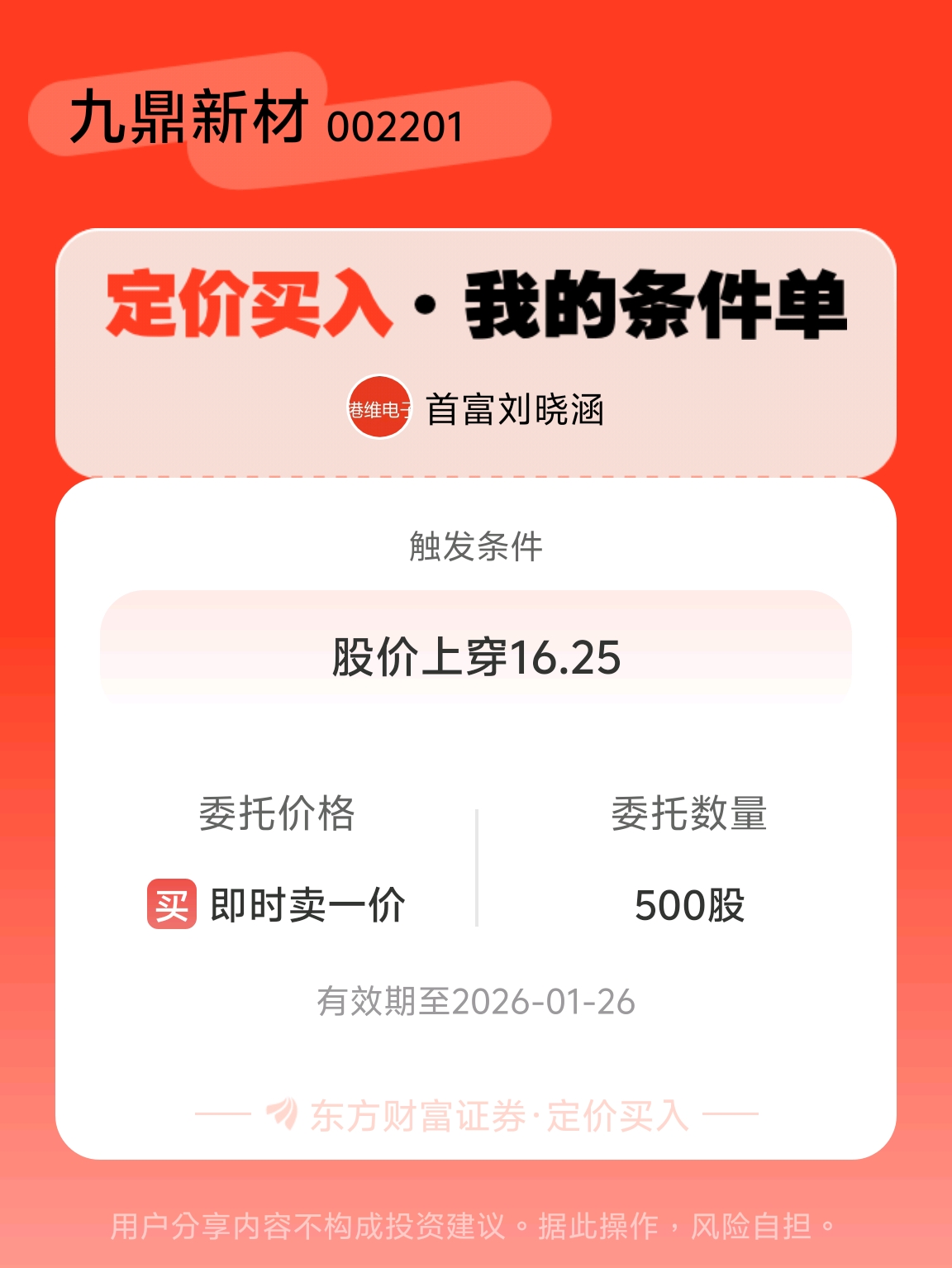 #条件单交流# #定价买入晒单# 一位股神设置了一个定价买入条件单,接下来就是见证奇迹的时刻~$九鼎新材(SZ002201)$