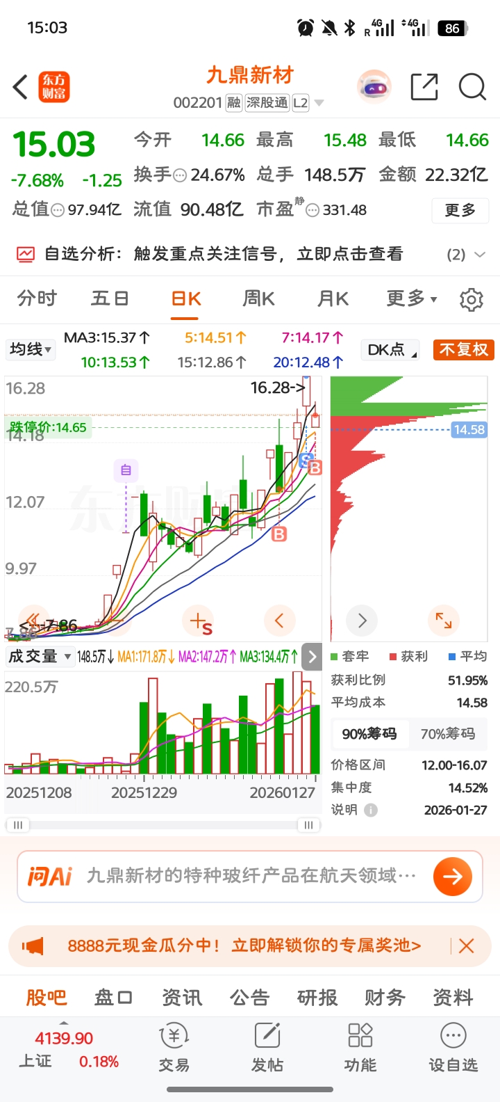 $九鼎新材(SZ002201)$ 今天不跌停就是我的买点,明天看早盘竞价是跑是留