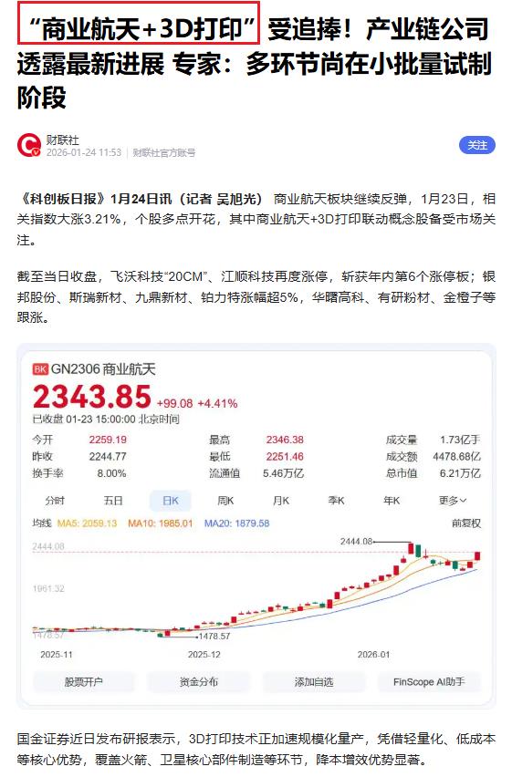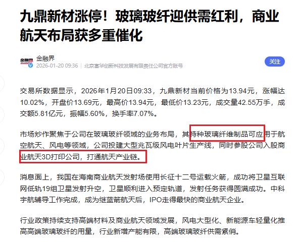 九鼎新材:特种玻璃纤维制品可应用于航空航天、风电等领域,公司投建大型兆瓦级风电叶片生产线,同时参股公司入股商业航天3D打印公司,打通航天产业链。今天板块比较强的是$巨力索具(SZ002342)$ $航天电子(SH600879)$ $中超控股(SZ002471)$ .