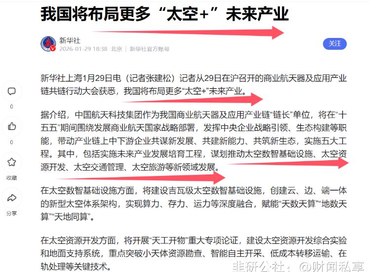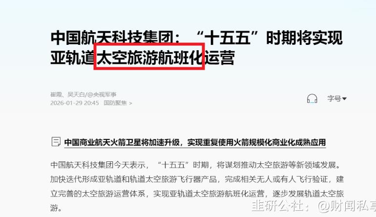 “航天飞船”概念横空出世!中国太空旅游将航班化 亚轨道和轨道飞行体验。中国航天科技集团今天表示,“十五五”时期,将谋划推动太空旅游等新领域发展。加快迭代形成亚轨道和轨道太空旅游飞行器产品,完成相关无人或有人飞行验证,建立完善的太空旅游运营体系,实现亚轨道太空旅游航班化运营,逐步发展轨道太空旅游。$航天科技(SZ000901)$ $神剑股份(SZ002361)$ ...
