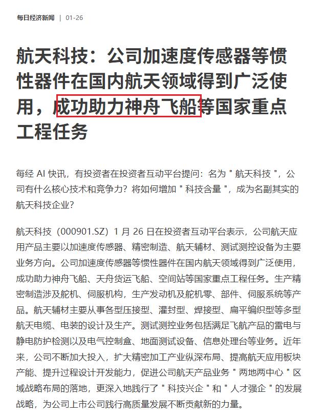 公司航天应用产品主要以加速度传感器、精密制造、航天辅材、测试测控设备为主要业务方向。公司加速度传感器等惯性器件在国内航天领域得到广泛使用,成功助力神舟飞船、天舟货运飞船、空间站等国家重点工程任务。