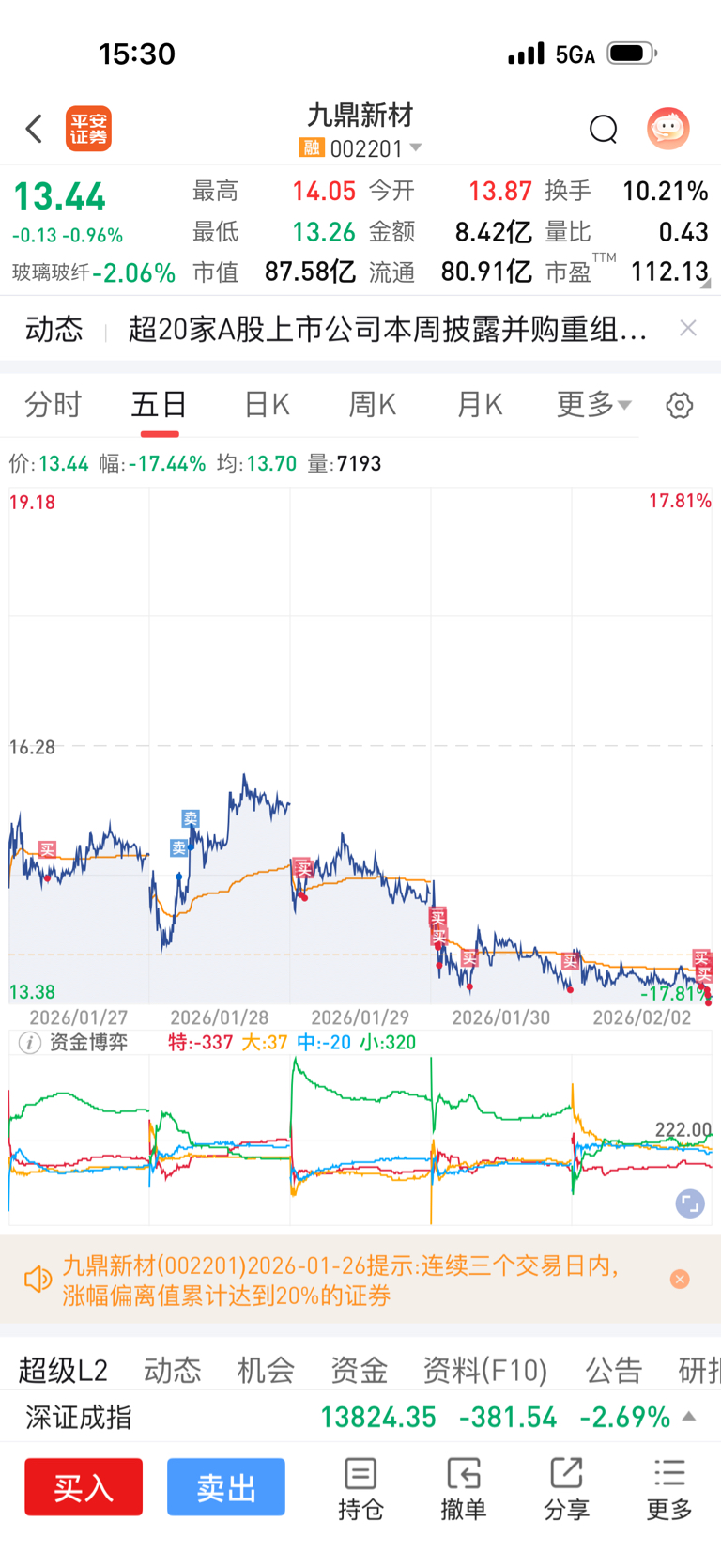 $九鼎新材(SZ002201)$ 明天不行就割肉了,拜拜