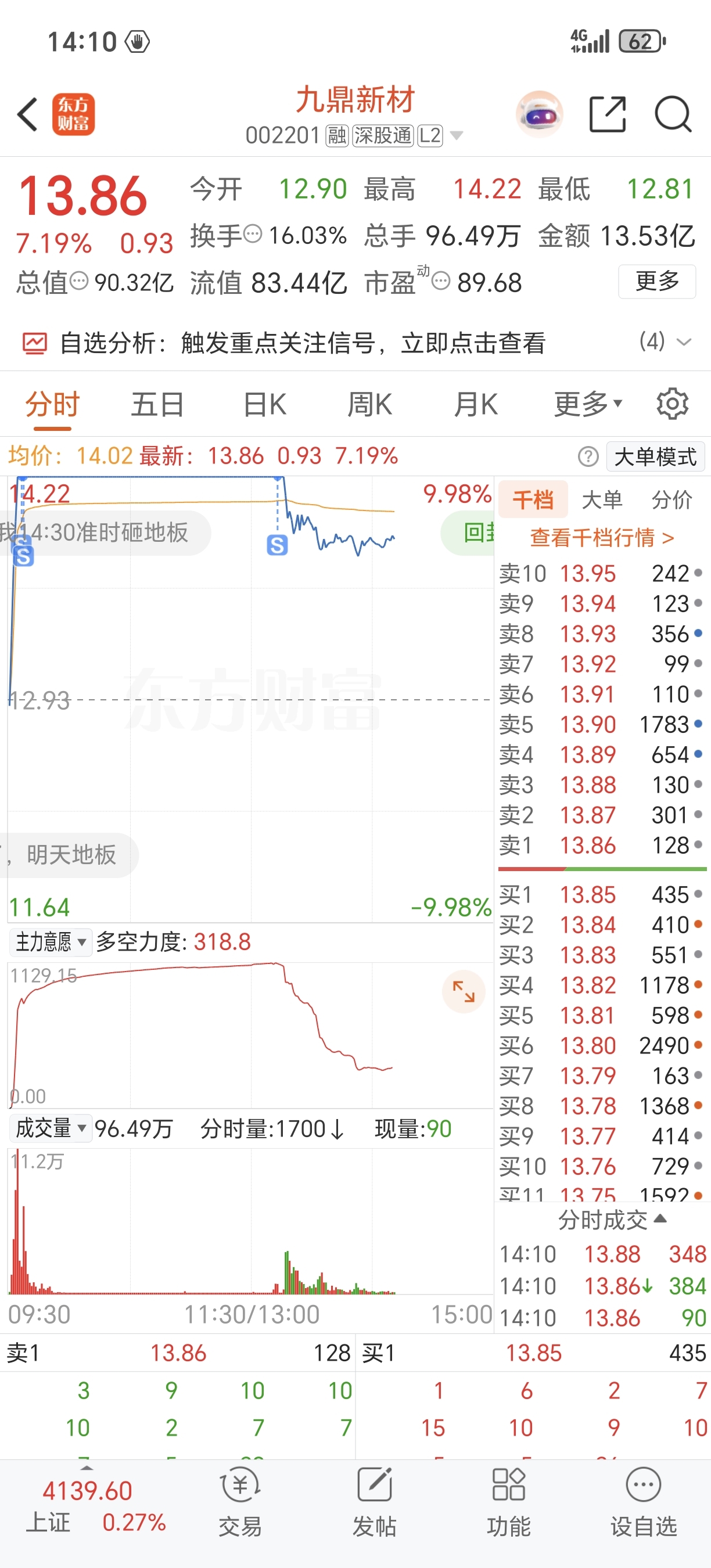 $九鼎新材(SZ002201)$ 15元入坑,韭菜一枚,不会操作,就一直补补补,直到今天小赚两千块跑路了,码的折磨死我了,再也不入航天了。
