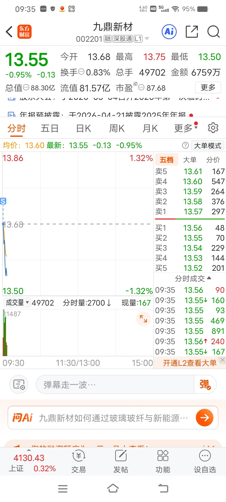 $九鼎新材(SZ002201)$ 先跑了,不高开不及预期