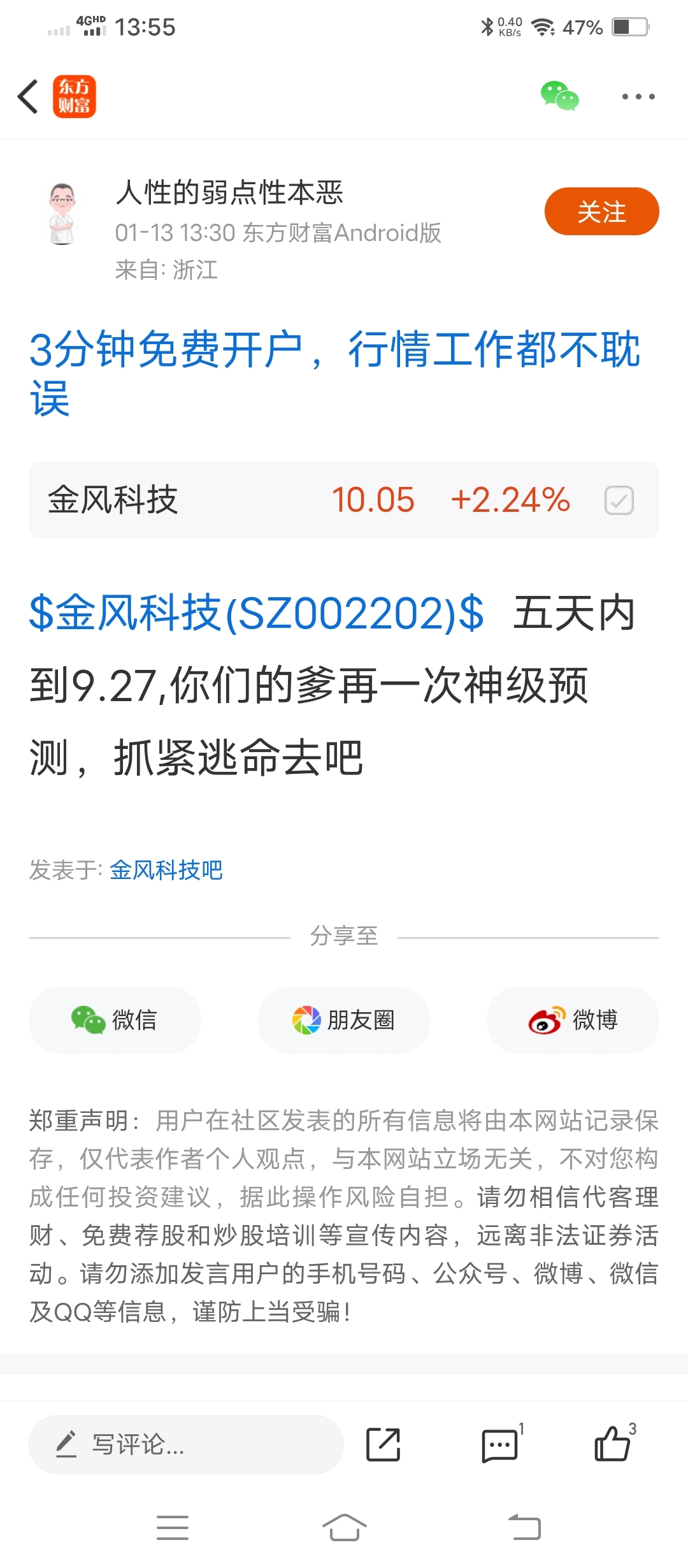 温馨提示: 1.根据《证券法》规定,禁止编造、传播虚假信息或者误导性信息,扰乱证券市场;2.用户在本社区发表的所有资料、言论等仅代表个人观点,与本网站立场无关,不对您构成任何投资建议。用户应基于自己的独立判断,自行决定证券投资并承担相应风险。《东方财富社区管理规定》