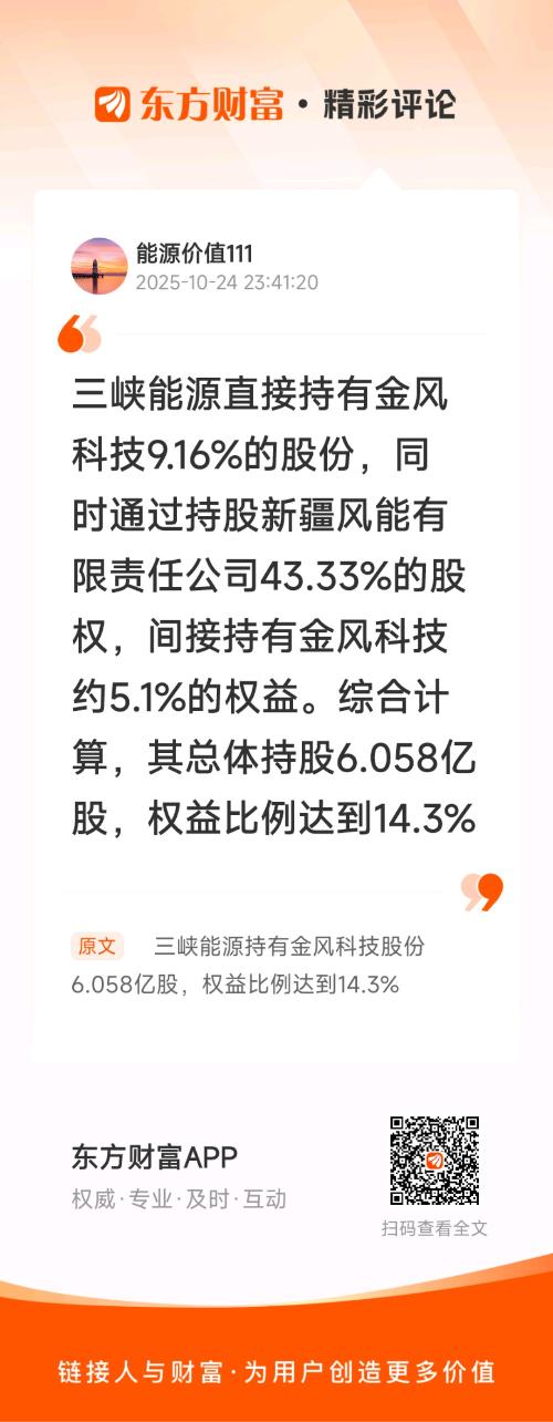 $三峡能源(SH600905)$ 三峡能源持有金风科技股份6.058亿股,权益比例达到14.3%