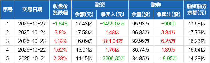 金风科技:融资净偿还1455.02万元,融资余额17.43亿元(10-27)
