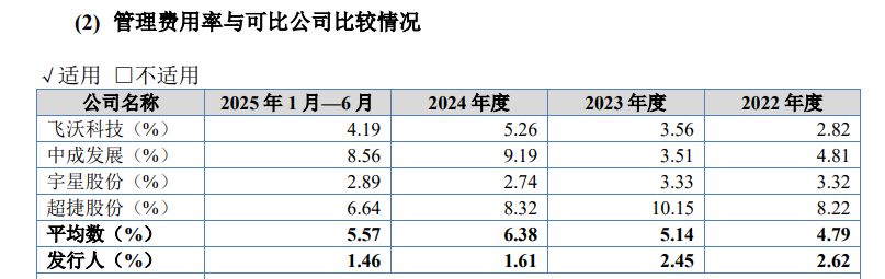 2022年至2025年上半年,定西高强的管理费用率分别为2.62%、2.45%、1.61%和1.46%,远低于其同行业可比公司平均水平的4.79%、5.14%、6.38%和5.57%。而且,定西高强的管理费用率与同行业可比公司平均水平在报告期内的变动趋势相反。