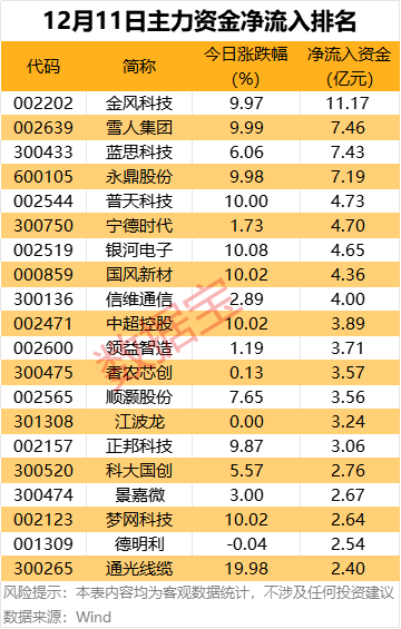 金风科技主力资金净流入11.17亿元,居首。今日风电板块逆市走强,金风科技涨停,海力风电大涨8%,双一科技涨超6%,泰胜风能、中环海陆、运达股份、大金重工等跟涨。