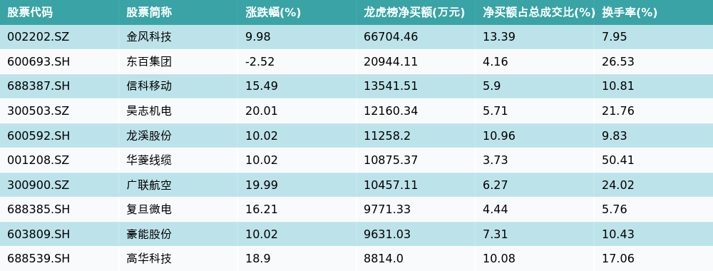 南财智讯12月25日电,南财金融终端数据显示,因当日异动登上龙虎榜的个股中,资金净买入最多的前三位分别是金风科技(002202.SZ)、东百集团(600693.SH)与信科移动(688387.SH)。其中排名第一的金风科技净买额达6.67亿元,占总成交金额的13.39%。金风科技当日收盘上涨9.98%,换手率为7.95%,净买入额前10个股详情见下图: