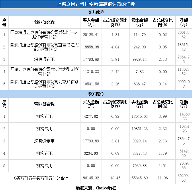 深交所2025年12月29日交易公开信息显示,金风科技因属于当日涨幅偏离值达7%的证券、连续三个交易日内收盘价格涨幅偏离值累计20%而登上龙虎榜。金风科技当日报收21.66元,涨跌幅为10.01%,偏离值达10.33%,换手率6.57%,振幅5.79%,成交额46.70亿元。