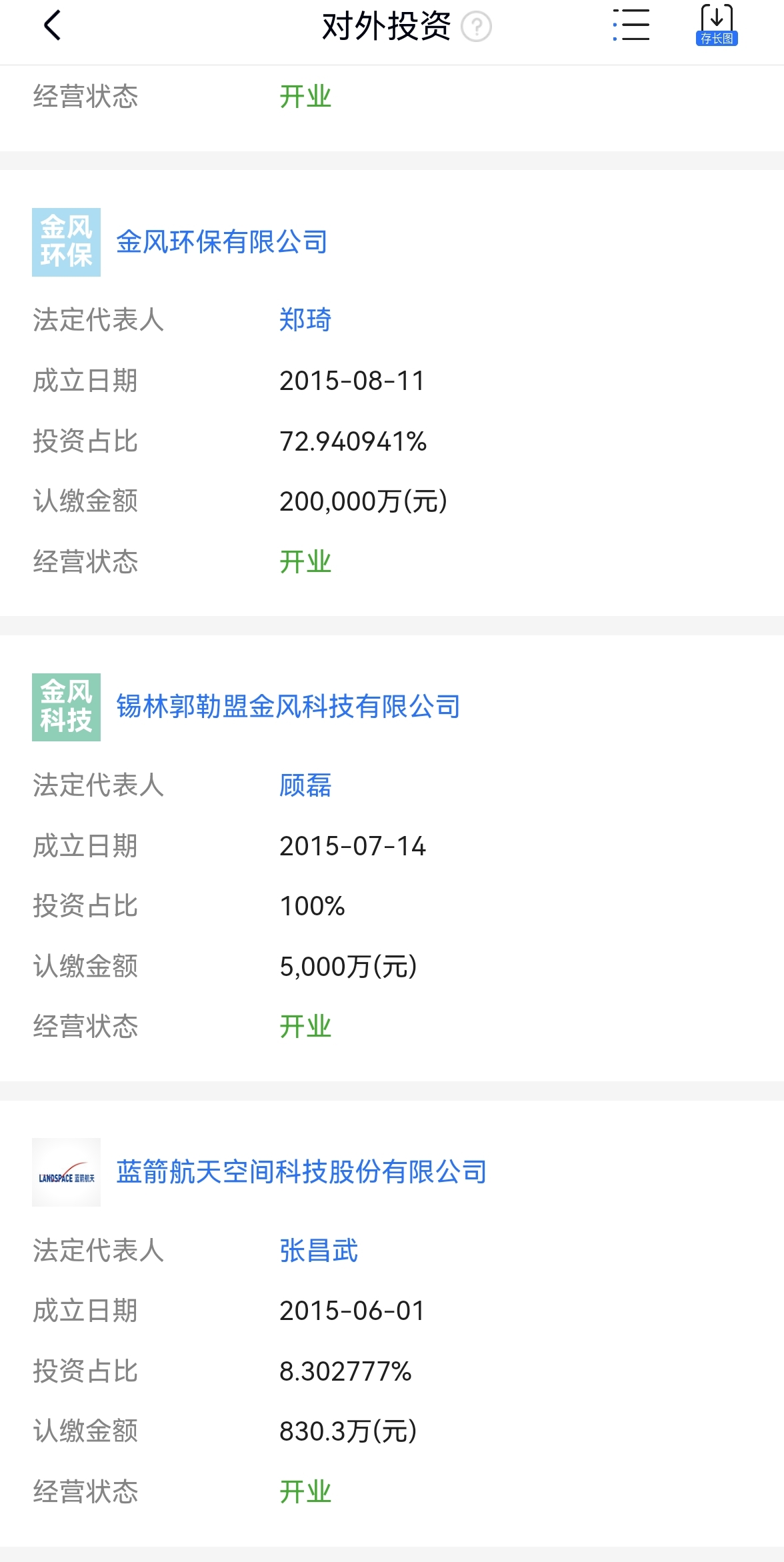 国家工商局公示的金风科技投资蓝箭航天,而且蓝箭航天股东信息变更里有金风科技,直到