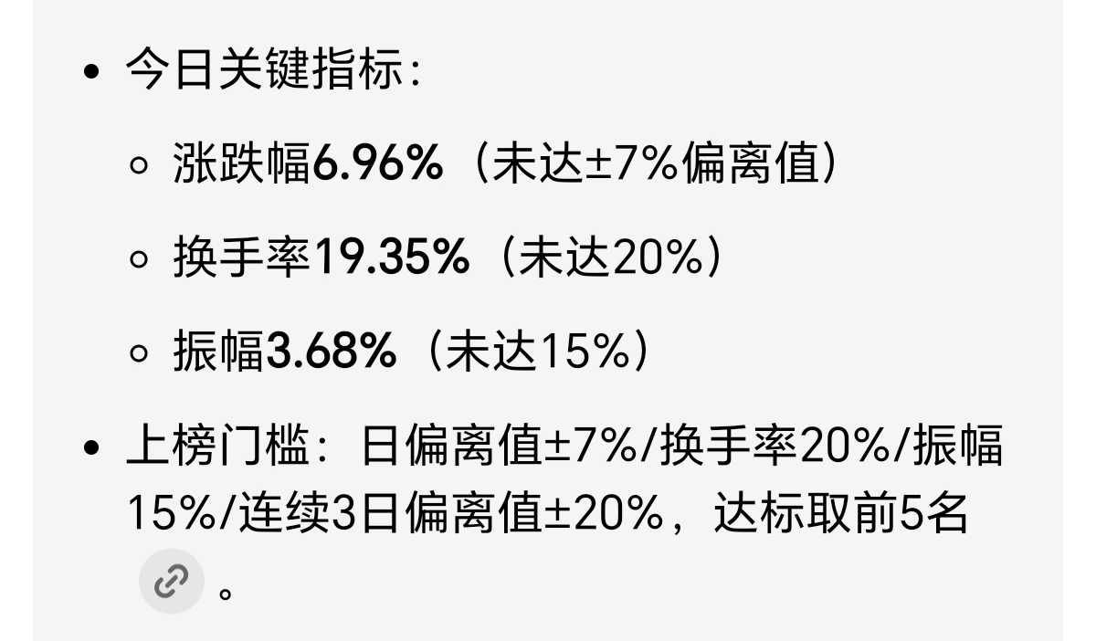 是这个意思么?没有龙虎榜可能,换手率、涨跌幅豆差一点……