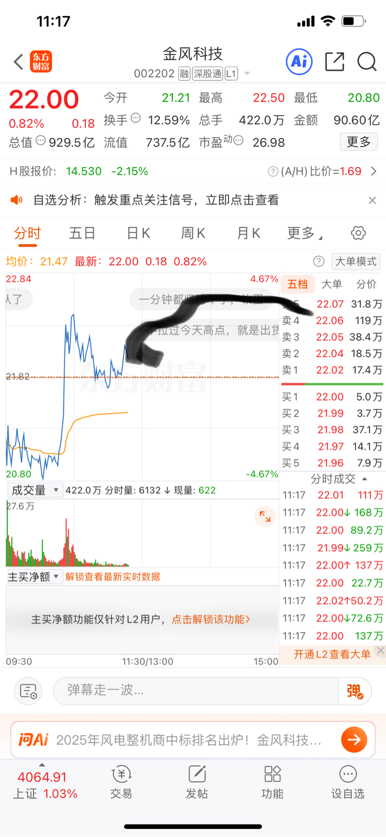 $金风科技(SZ002202)$ 马上涨停,线画好了的