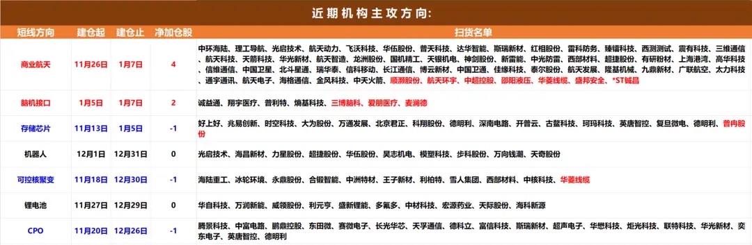机构资金10日内连续买入(1000万+):航天环宇688523,商业航天,1月5日-1月7日,机构资金3次净买入,1月7日净买入11832.66万,机构买入量较之前大幅增加。华菱线缆001208,商业航天+可控核聚变,12月24日-1月7日,机构资金5次净买入,1月7日净买入3924.99万,机构买入量较之前大幅增加。普冉股份688766,存储芯片,1月5日-1月7日,机构资金2次净买入,1月7日净买入23148.1万,机构买入量较之前大幅增加。麦澜德688273,脑机接口,1月6日-1月7日,机构资金2次净买入,1月7日净买入2199.46万,机构买入量较之前小幅减少。