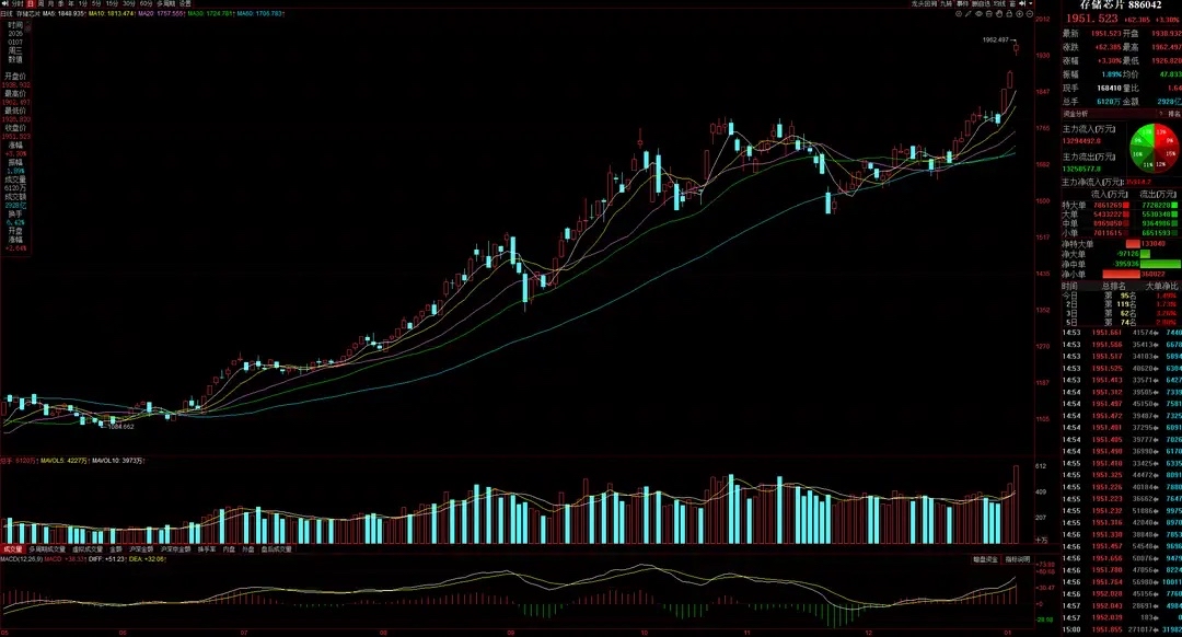 板块技术面:存储芯片中短期表现都要明显强于A股大盘。去年11月前,板块刚刚走完一轮大级别的趋势主升浪。蓄势仅2个月后,近期板块再次井喷大涨,开启了新一轮的上行趋势。不过昨天跳空高开高走后,目前板块指数超买较为明显。