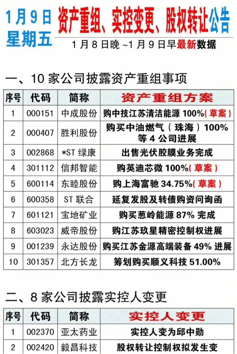 1.09周五最新:资产重组,实控人变更,股权转让公告!一、10家公司披露资产重组