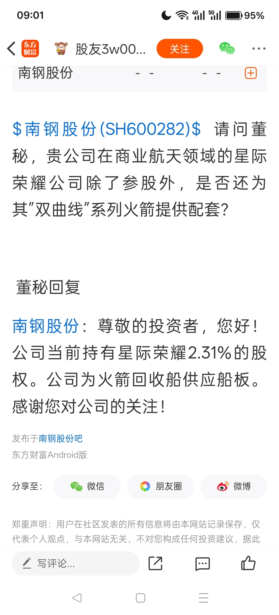 $金风科技(SZ002202)$ 请问董秘,贵公司在商业航天领域的星际荣耀公司除了参股外,是否还为其”双曲线”系列火箭提供配套? 董秘回复南钢股份:尊敬的投资者,您好!公司当前持有星际荣耀2.31%的股权。公司为火箭回收船供应船板