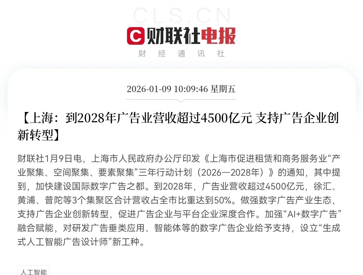 上午10点09分,上海印发了《上海市促进租赁和商务服务业“产业聚集、空间聚集、要素聚集”三年行动方案(2026—2028年)》,其中强调要加快建设国际数字广告之都,到2028年广告业营收超过4500亿元,支持广告企业创新转型,加强“AI+数字广告”融合赋能,此消息一出,持有AI应用的股民们兴奋的跳起来了,这对于AI营销、文化传媒又是重大利好消息,政策鼓励广告业拥抱“AI+”,将极大解放创意生产力,传统媒介户外、电视、广播等将加速数字化、智能化改造,与线上数据打通,大型传媒集团或广告公司,将借助政策红利和自身资源,转型为整合技术、数据、创意、媒介的营销科技平台,AI不再是可有可无的辅助工具,而是提升产业能级的核心引擎,AI应用将会成为2026年的爆发元年,AI营销大有可为!