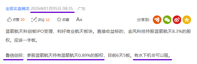鲁信创投:参股蓝箭航天持有蓝箭航天0.89%的股权,周一早盘就分享过,有水下机会可以低吸,已经连续四天涨停,今天继续一字板,认真看文的已经收获四连板,都是启动前给出的分析。够给力吧。