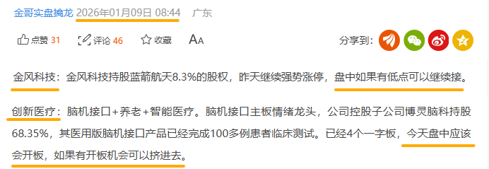 创新医疗:脑机接口+养老+智能医疗。脑机接口主板情绪龙头,公司控股子公司博灵脑科持股68.35%,其医用版脑机接口产品已经完成100多例患者临床测试。今天早盘讲过盘中会开板,如果有开板机会可以挤进去。回封成功,这些都是原话。