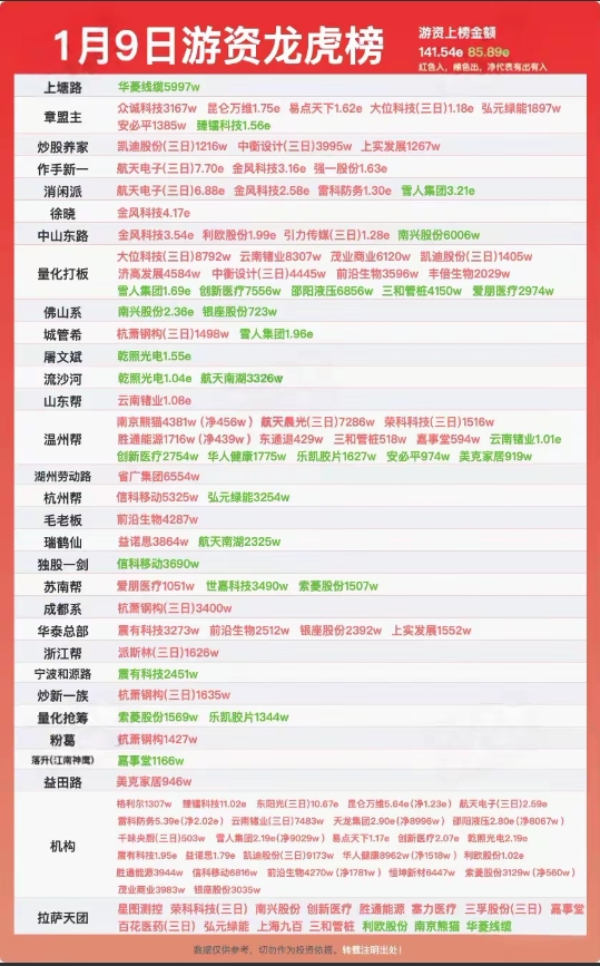 各位老铁,整理了1月9日游资龙虎榜核心动向,哪些标的被游资扎堆炒作,一眼看明白!