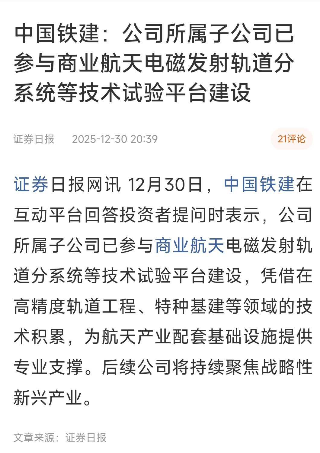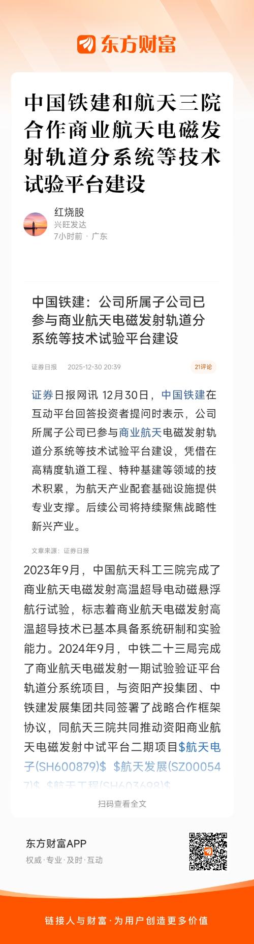 2023年9月,中国航天科工三院完成了商业航天电磁发射高温超导电动磁悬浮航行试验,标志着商业航天电磁发射高温超导技术已基本具备系统研制和实验能力。2024年9月,中铁二十三局完成了商业航天电磁发射一期试验验证平台轨道分系统项目,与资阳产投集团、中铁建发展集团共同签署了战略合作框架协议,同航天三院共同推动资阳商业航天电磁发射中试平台二期项目$航天电子(SH600879)$ $航天发展(SZ000547)$ $航天工程(SH603698)$