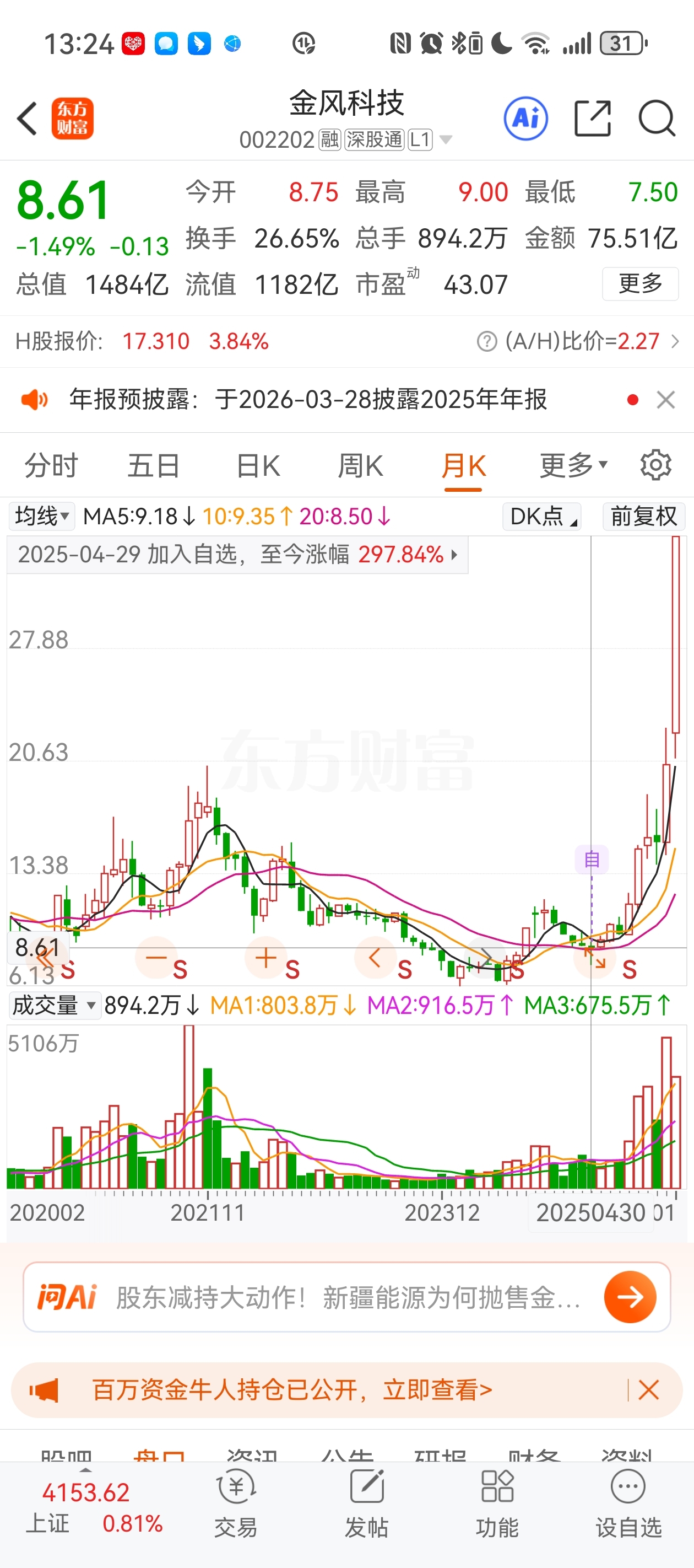 $金风科技(SZ002202)$ 底部加了自选一直看着涨没买错过一个亿