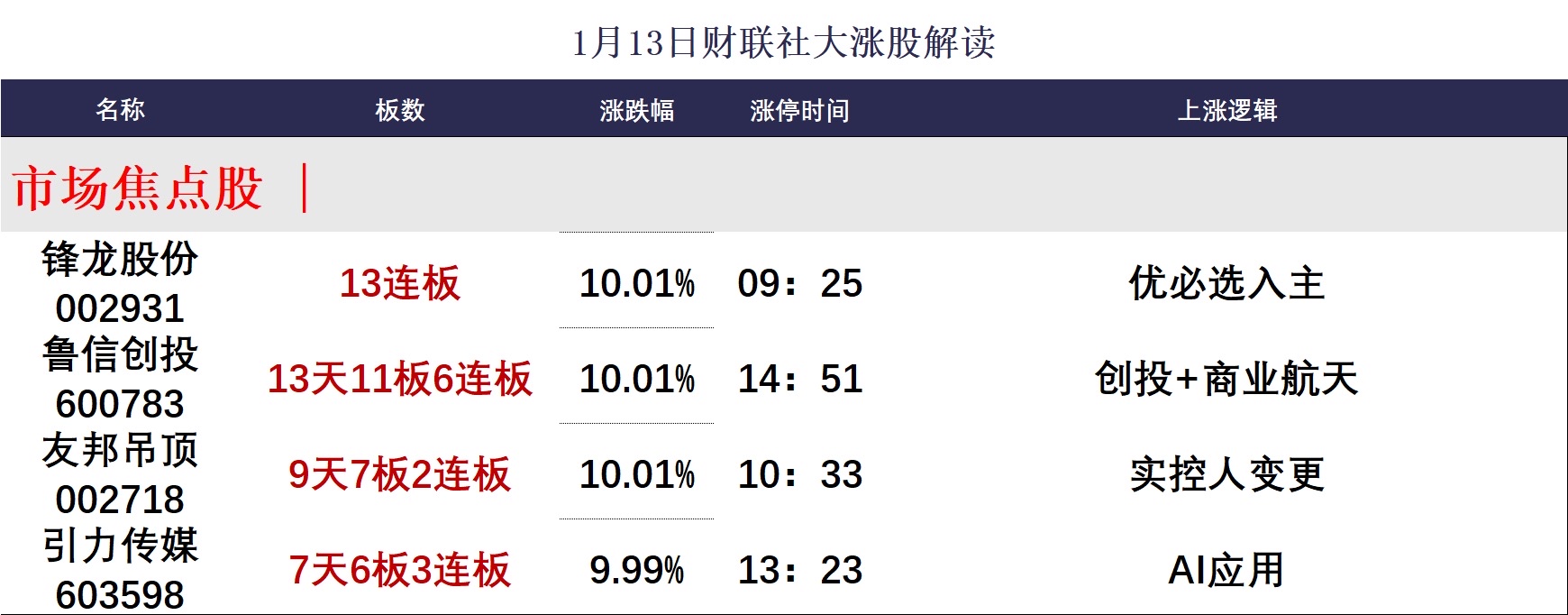 【1月13日涨停分析】今日全市场共66股涨停,连板股总数29只,61股封板未遂,