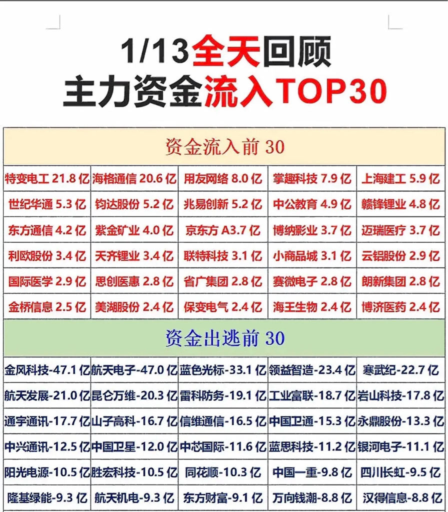1/13 全天回顾主力资金流入TOP30,资金出逃TOP30,快来围观!