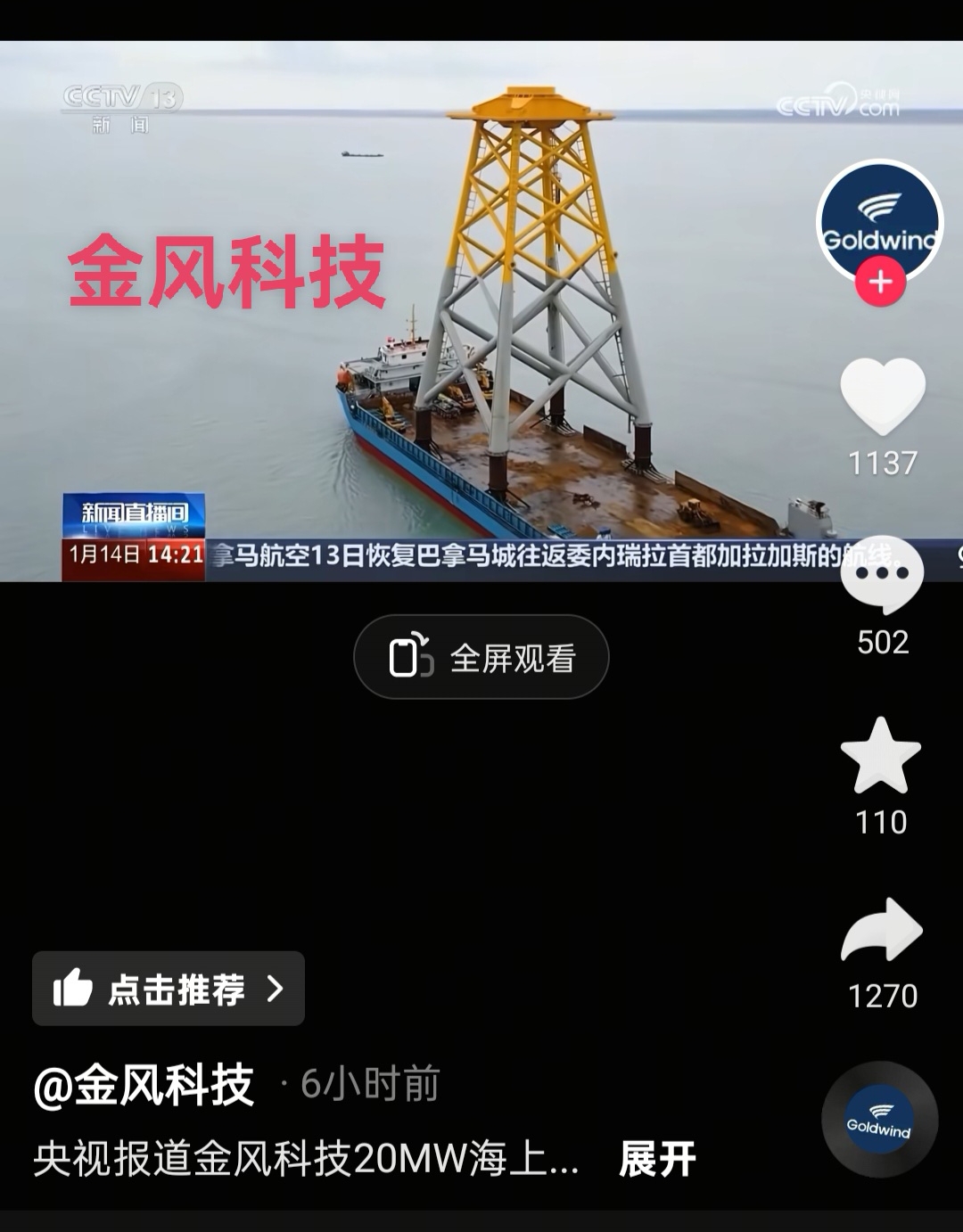 $金风科技(SZ002202)$ 今日央视播报午后