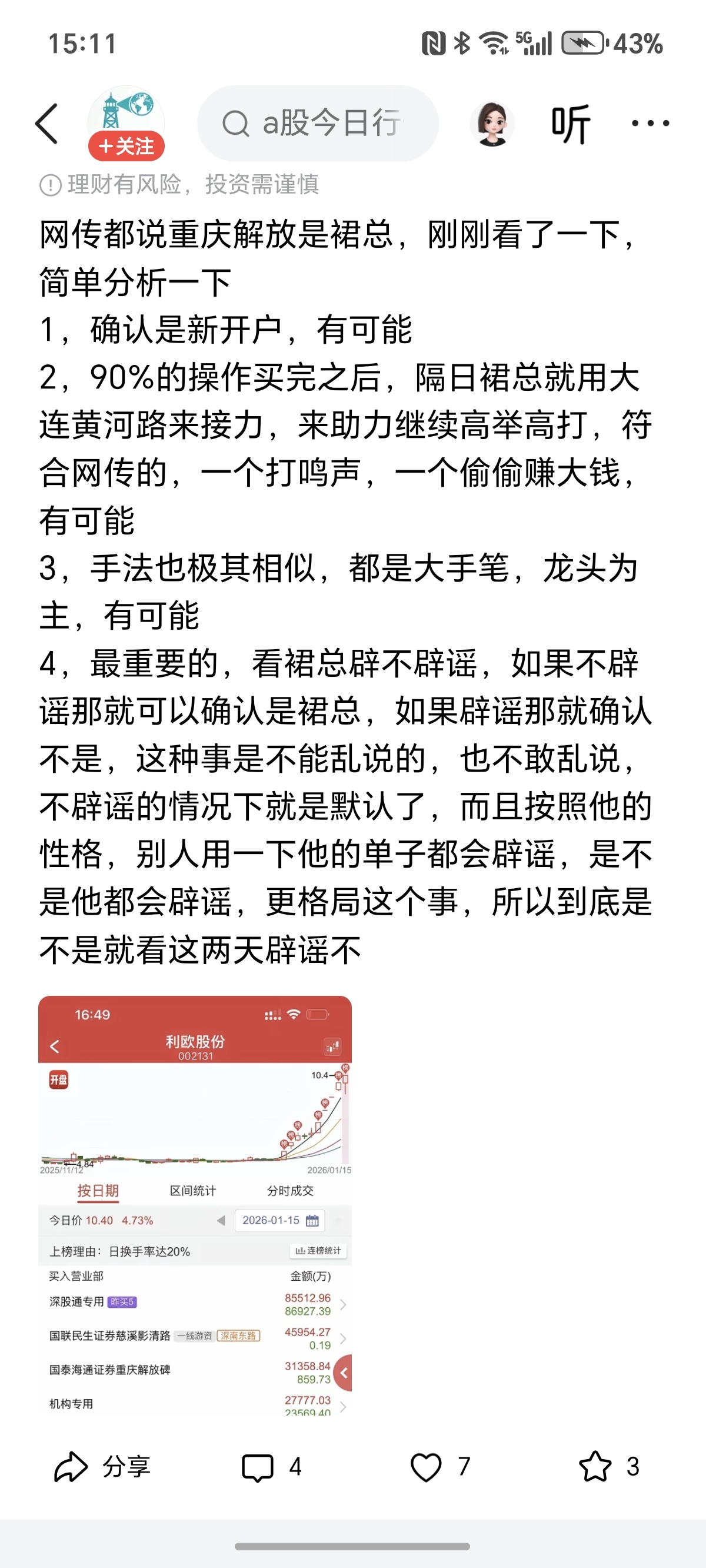 郑重声明:用户在财富号/股吧/博客等社区发表的所有信息(包括但不限于文字、视频、音频、数据及图表)仅代表个人观点,与本网站立场无关,不对您构成任何投资建议,据此操作风险自担。请勿相信代客理财、免费荐股和炒股培训等宣传内容,远离非法证券活动。请勿添加发言用户的手机号码、公众号、微博、微信及QQ等信息,谨防上当受骗!