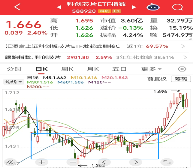 老孟在10月就提过科创芯片、机器人,也逐步分批做了一些布局。以$科创芯片ETF指数(SH588920)$ 来看,大概是从1.5开始买入的,最低到了1.35,经过11月、12月的两次底部震荡,基本上持仓成本也就在1.4左右,12月中旬开始就一路上涨,最近最高涨到了1.7,基本两个多月就有近20%的涨幅收益。这里边有这样几点体会,一是对行业板块提前做好了解,熟悉其未来的趋势和中长期支撑逻辑;二是做好分批布局,通过这种投资方式来降低择时的难度,不要总想买在最好的时机,这样反而容易错过机会;第三就是不要单买个股,这样选择的难度会极大,而通过行业板块指数ETF的方式,其实更容易把握投资机会。