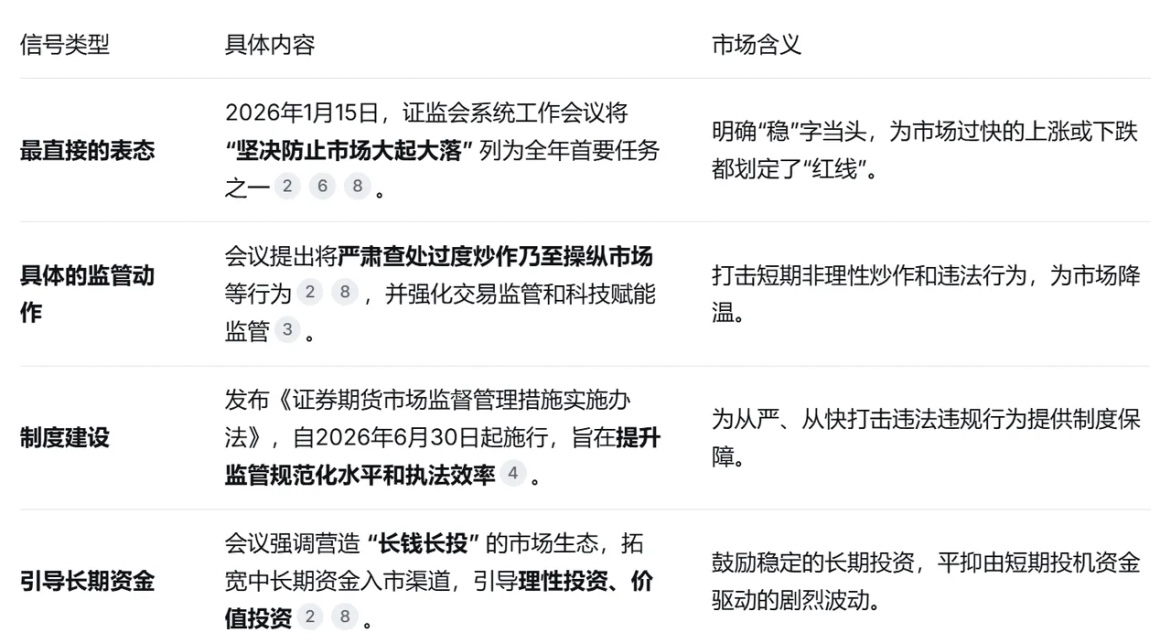 近期,监管层连续释放明确信号,为过热的市场预期降温。在1月15日的证监会系统工作会议上,“坚决防止市场大起大落”被列为全年首要任务,直接定调“稳”字当头。