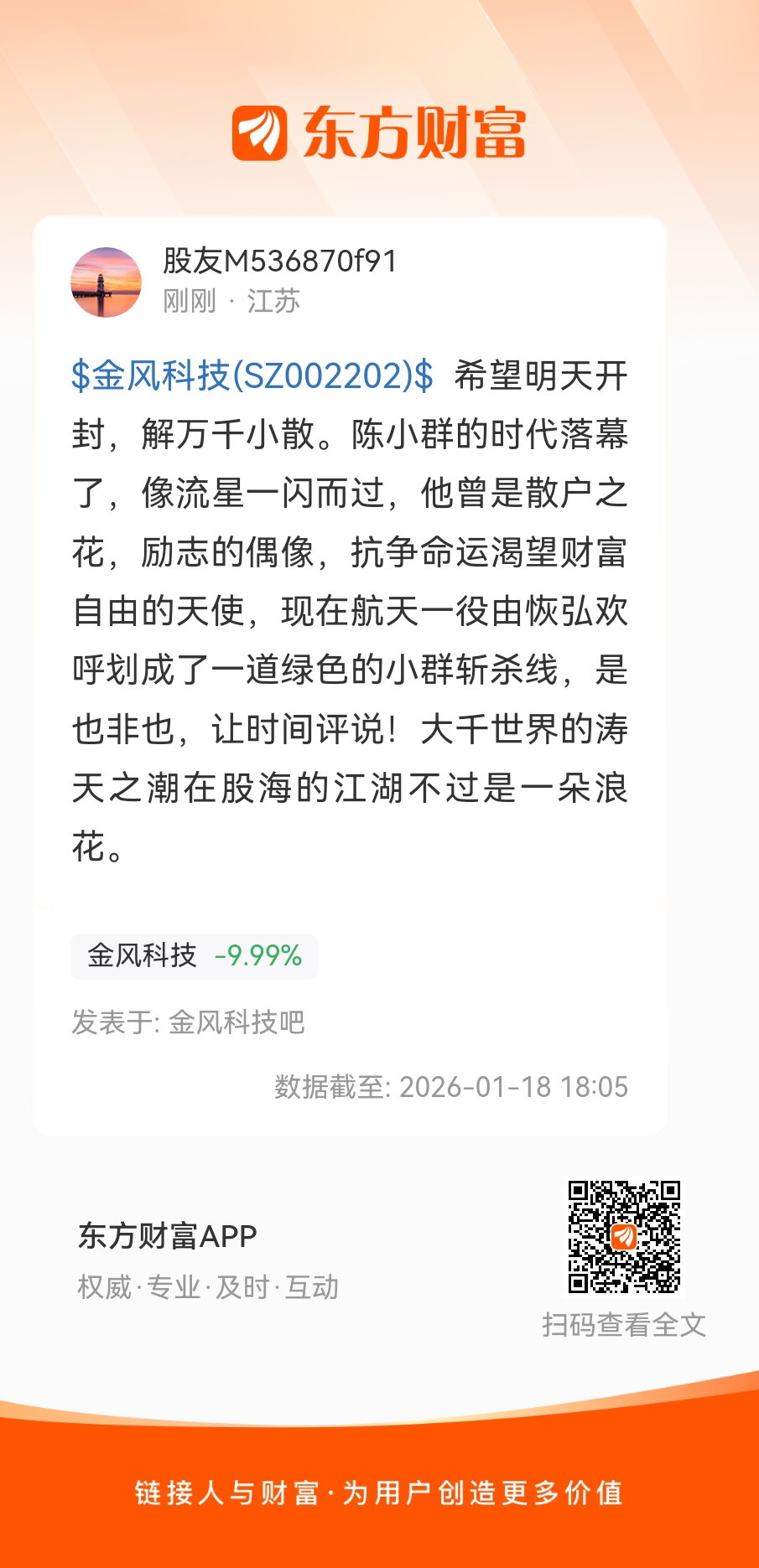 $金风科技(SZ002202)$ 希望明天开封,解万千小散。陈小群的时代落幕了,像流星一闪而过,他曾是散户之花,励志的偶像,抗争命运渴望财富自由的天使,现在航天一役由恢弘欢呼划成了一道绿色的小群斩杀线,是也非也,让时间评说!大千世界的涛天之潮在股海的江湖不过是一朵浪花。