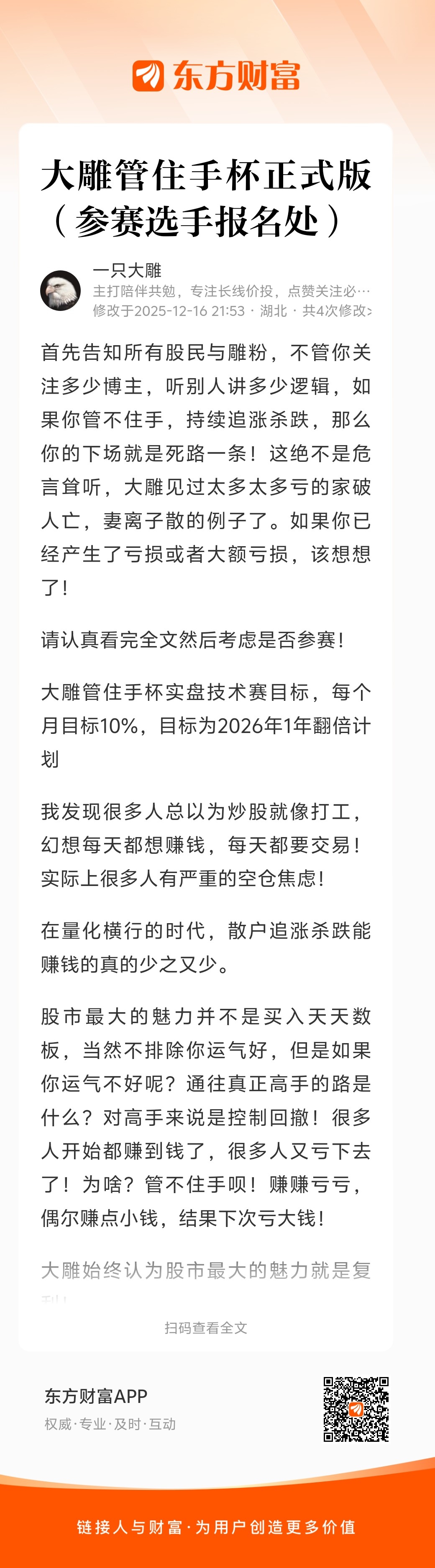 $金风科技(SZ002202)$ $岩山科技(SZ002195)$ $平潭发展(SZ000592)$ 散户追涨杀跌很难赚到钱的,所以我天天说管住手!如果你追涨杀跌已经产生亏损或者持续亏损,欢迎参加管住手练习赛!只要你能管住手,2026涅槃重生!已经有数千人报名参赛啦,就等你了