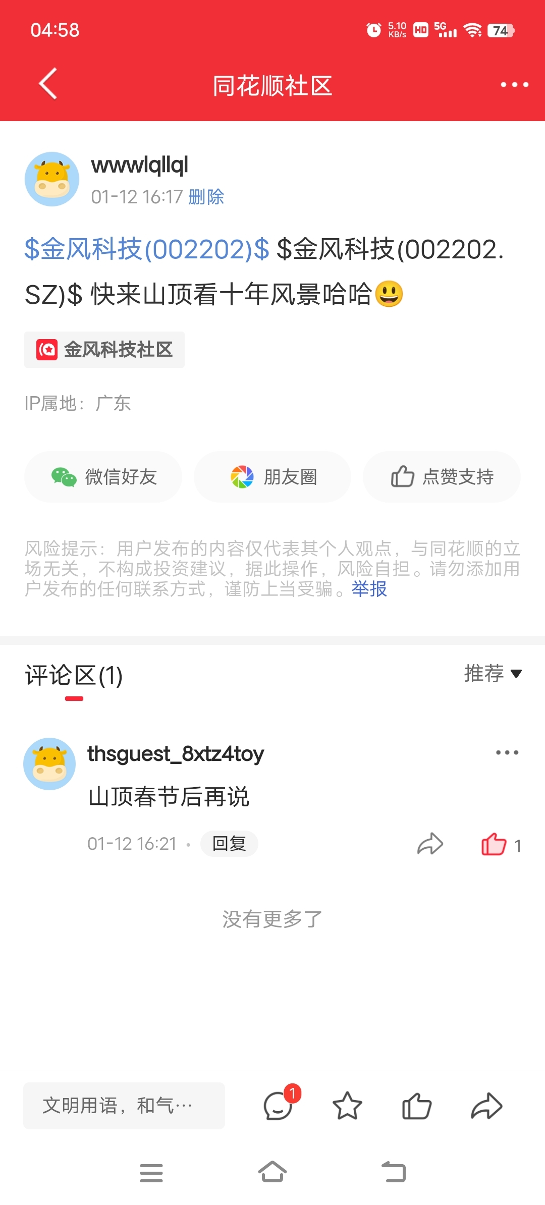 温馨提示: 1.根据《证券法》规定,禁止编造、传播虚假信息或者误导性信息,扰乱证券市场;2.用户在本社区发表的所有资料、言论等仅代表个人观点,与本网站立场无关,不对您构成任何投资建议。用户应基于自己的独立判断,自行决定证券投资并承担相应风险。《东方财富社区管理规定》