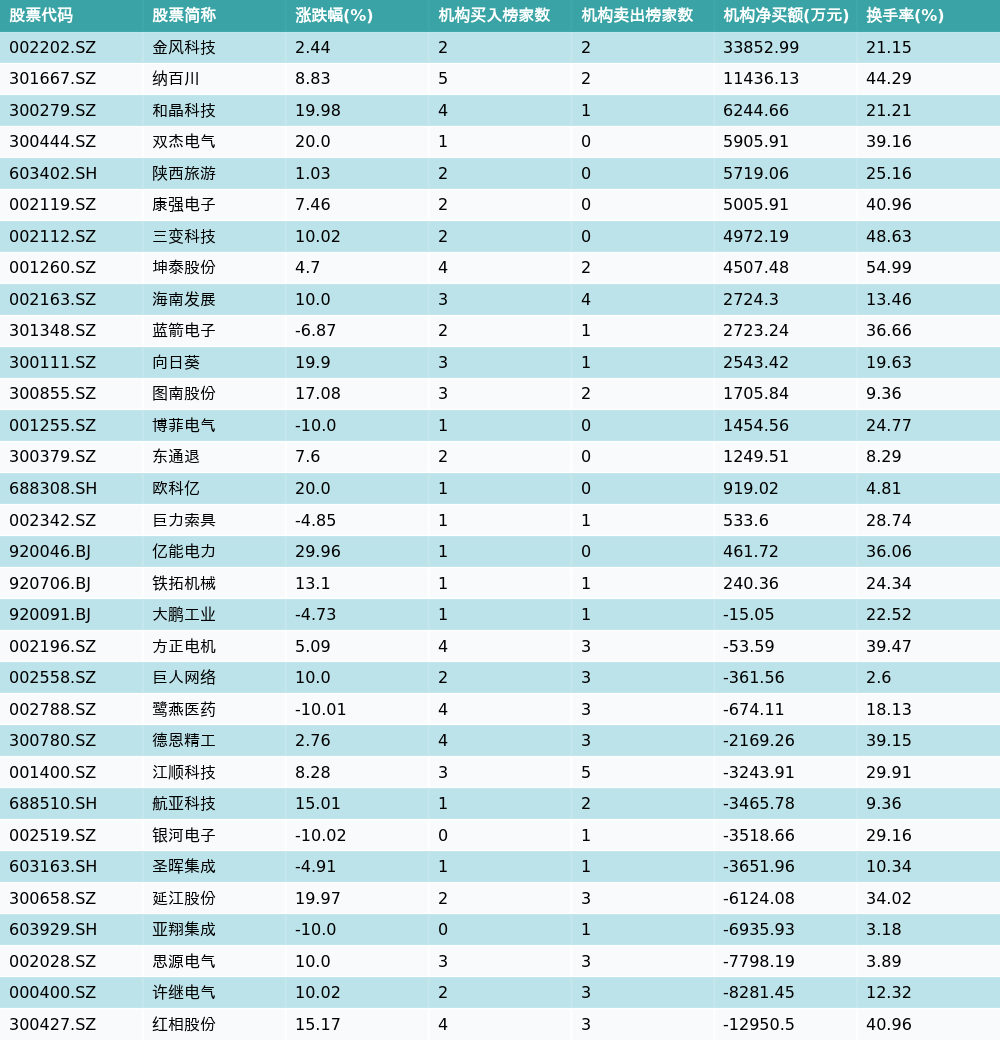21智讯1月19日电,南财金融终端数据显示,因当日异动登上龙虎榜的个股中,32只沪深A股龙虎榜出现了机构的身影,机构合计净买入32955.87万元,具体来看,机构净买入18只个股,净卖出14只个股。其中,机构净买入前三分别为金风科技(002202.SZ)、纳百川(301667.SZ)与和晶科技(300279.SZ),详情见下图:机构净卖出的个股中,前三分别为红相股份(300427.SZ)、许继电气(000400.SZ)与思源电气(002028.SZ)。