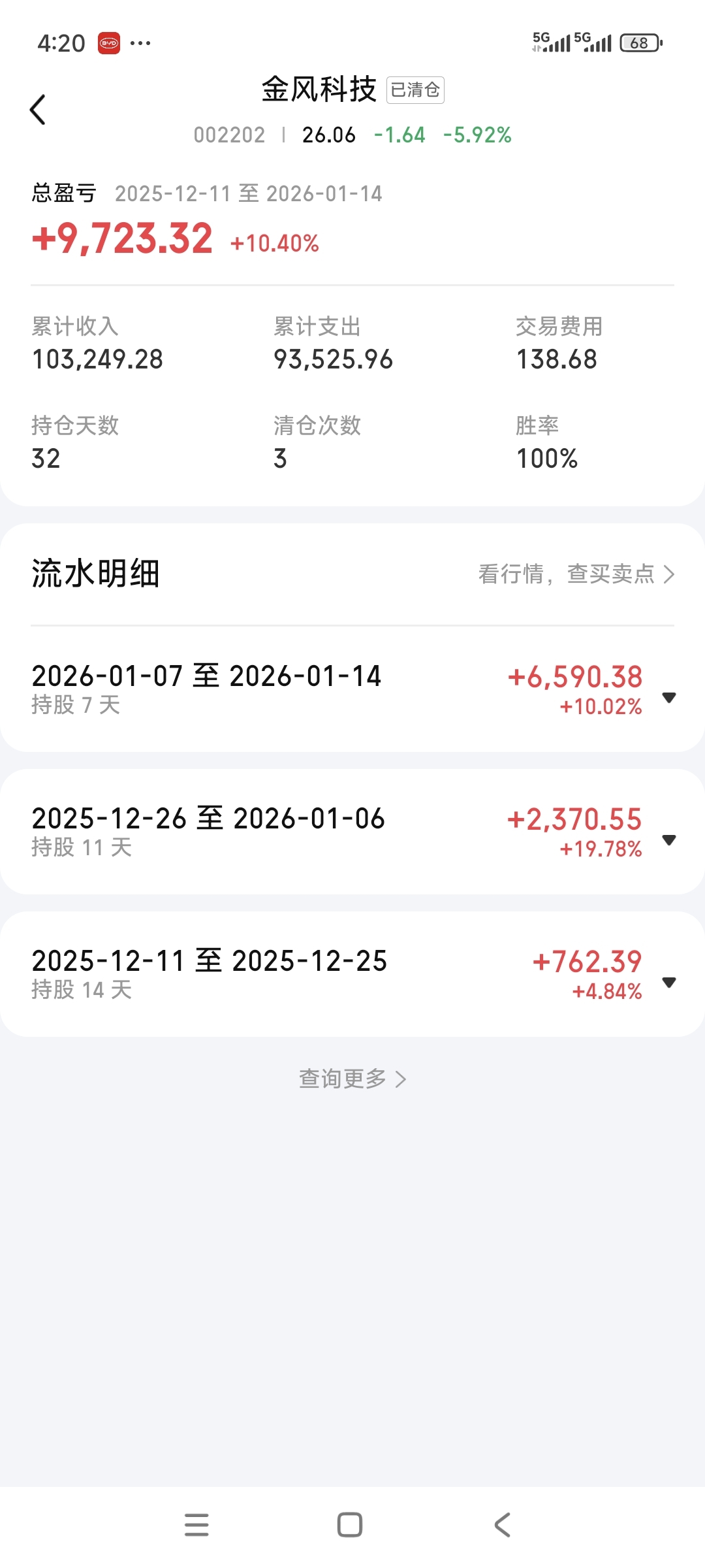 虽然最后吃了近20个点的回撤,但还是非常感激金风科技和雷科防务。让我从一万块钱炒
