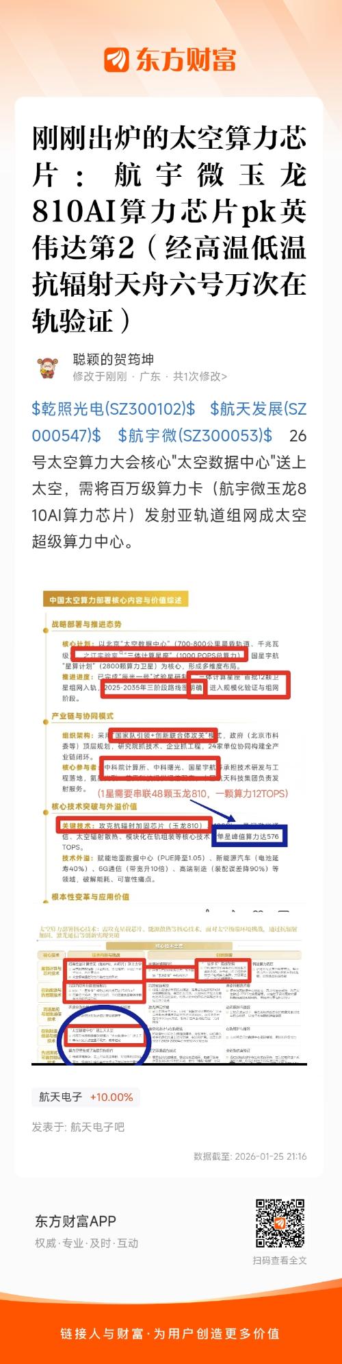 $金风科技(SZ002202)$$臻镭科技(SH688270)$$航宇微(SZ300053)$明星航宇微玉龙AI芯片(太空算力芯片)已进入国家太空算力网(目前玉龙810,后续升级版910在轨验证后量产)(太空算力引擎):玉龙810A算力12TOPS、功耗<6W(能效比2TOPS/W),“一星多卡”集群可至576TOPS(需要串联48颗玉龙810,一颗算力12TOPS,中科院计算所采用类似地面服务器的思路。在单颗卫星上搭载多枚航宇微玉龙810AI芯片组成算力集群),星上处理将传输成本降85%,单景船舶检测仅7秒。妥妥的太空英伟达,目前英伟达还没做到太空算力芯片,经高温低温抗辐射,天舟六号万次在轨验证;国内唯一,无竞争者,独一份