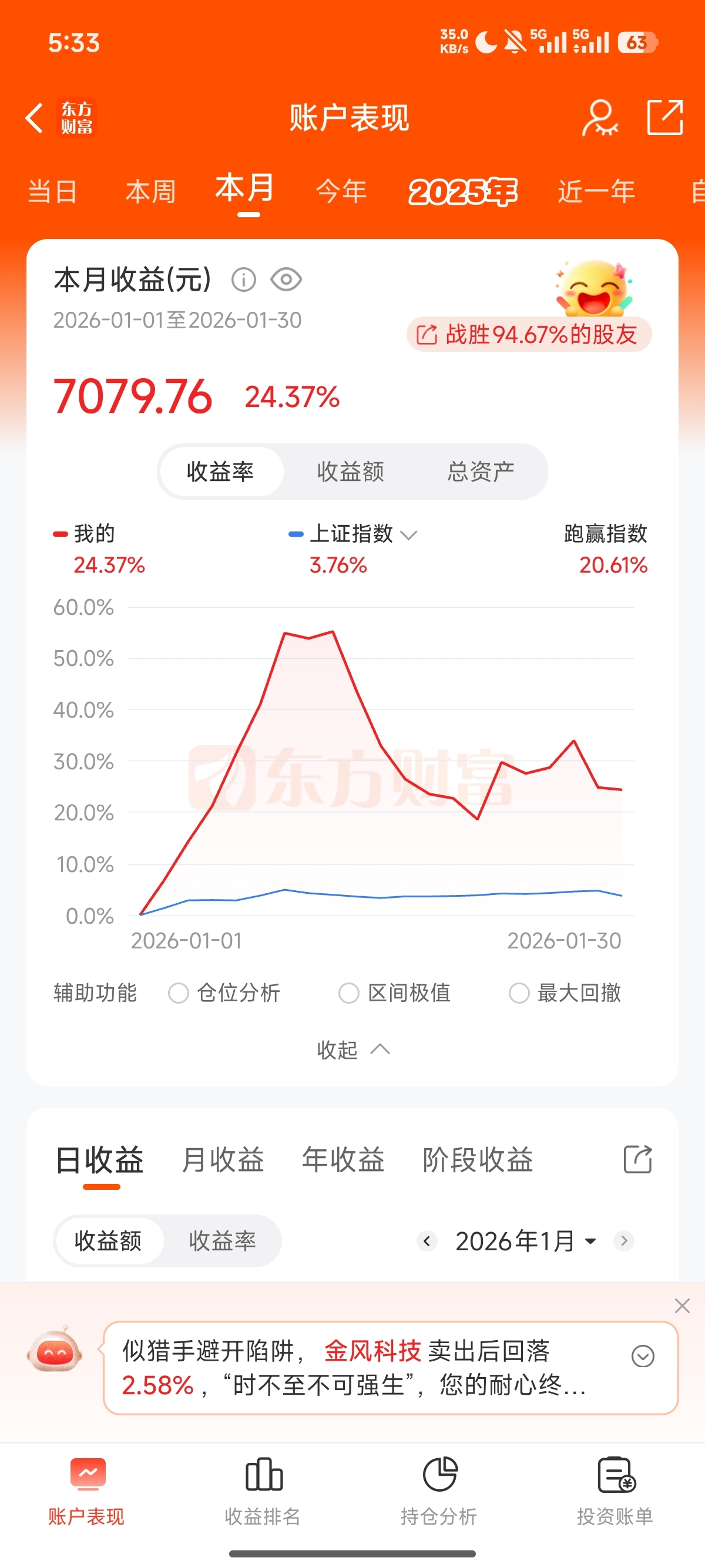 本月最高到50个点,都是金风给的,可惜退潮太快,硬吃2个跌停板,肉又回吐了。