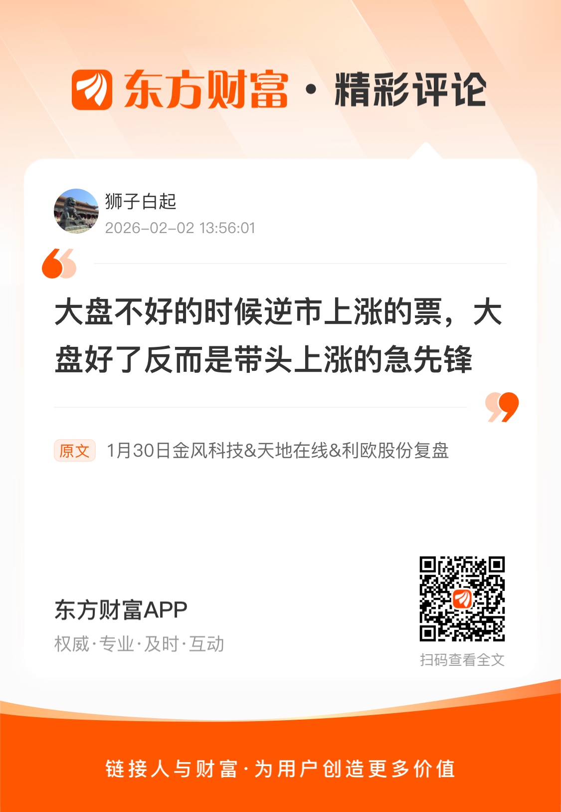 周一走势预测及操作,有SpaceX百万卫星的消息刺激,加上贵金属,有色的调整,周一资金大概率会进AI应用和商业航天,首选应该是AI应用。金风科技本身是消息面空窗期,加上趋势线以破,年报略低于预期,要看资金的流入力度了,短线会有一定承压。天地在线目前是情绪票,但热度还在20多名,只要热度没进入前五,就还没到顶,明天大概率是高开高走。利欧股份大概率平开或者小幅高开再逐步冲高。我是看好春节前AI应用成为投资主线的,短时间利欧的操作会以锁仓为主,如果各种信息都能支撑利欧会走主升趋势,那就可以无视短期的波动。我策略很简单,不破5日线,利欧我会一直拿,不到波段高点就持续锁仓不做T。