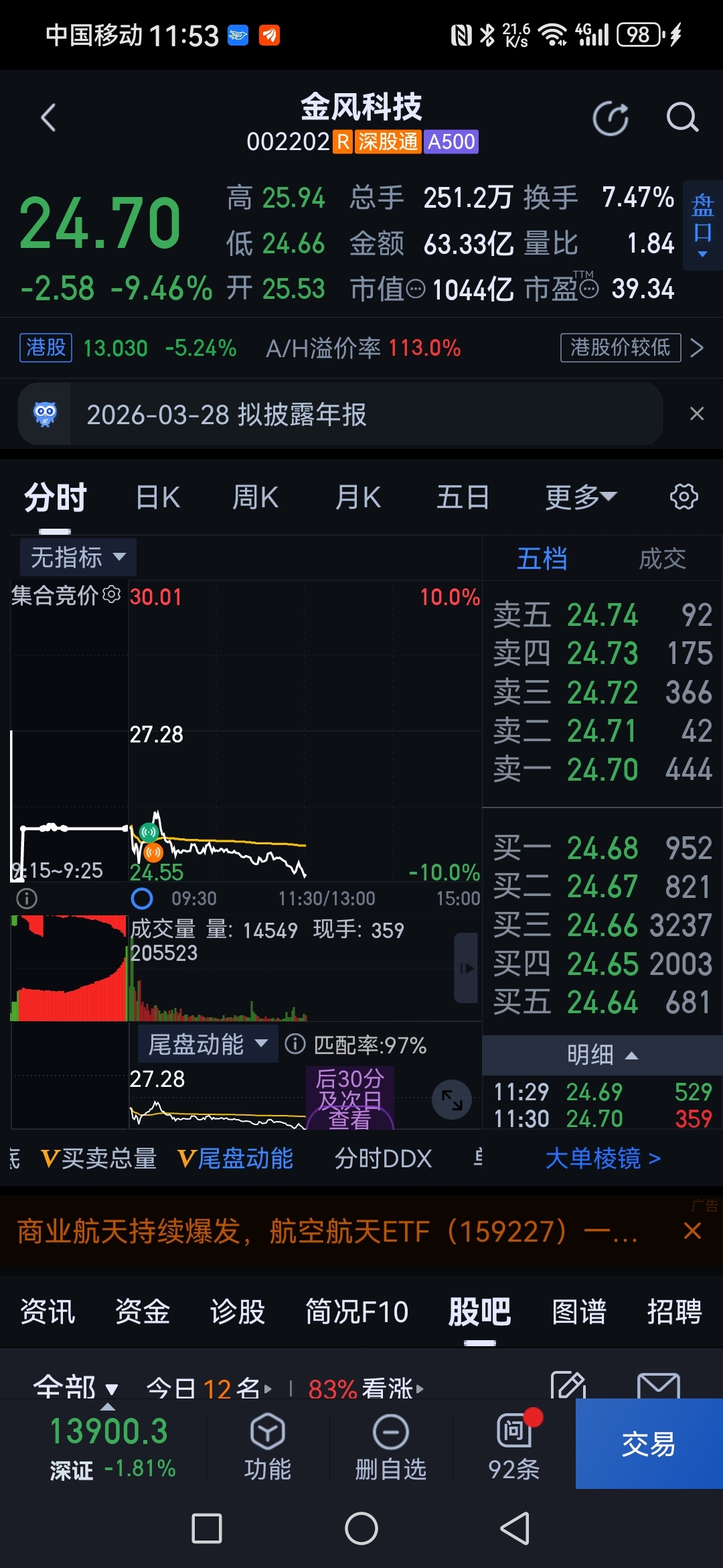 吃了金风科技的朋友们注意了,不能硬来,现价24.7不看好,今天是典型的破位下行态