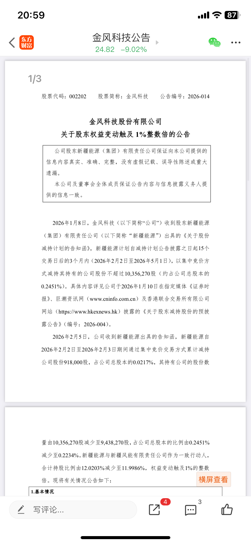 $金风科技(SZ002202)$ 大股东了又,搞不好明天又是跌停的一天