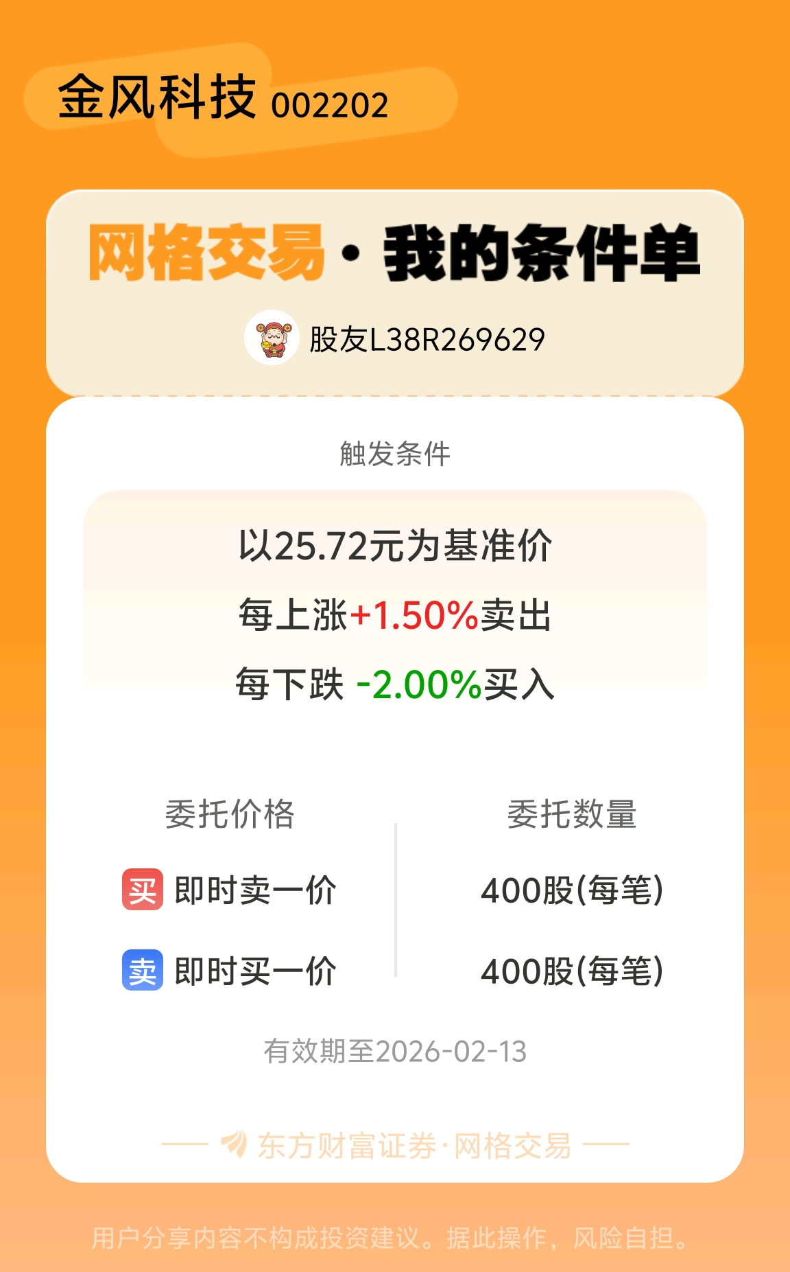 #条件单交流# #网格交易晒单# 一位股神设置了一个网格交易条件单,接下来就是见证奇迹的时刻~$金风科技(SZ002202)$