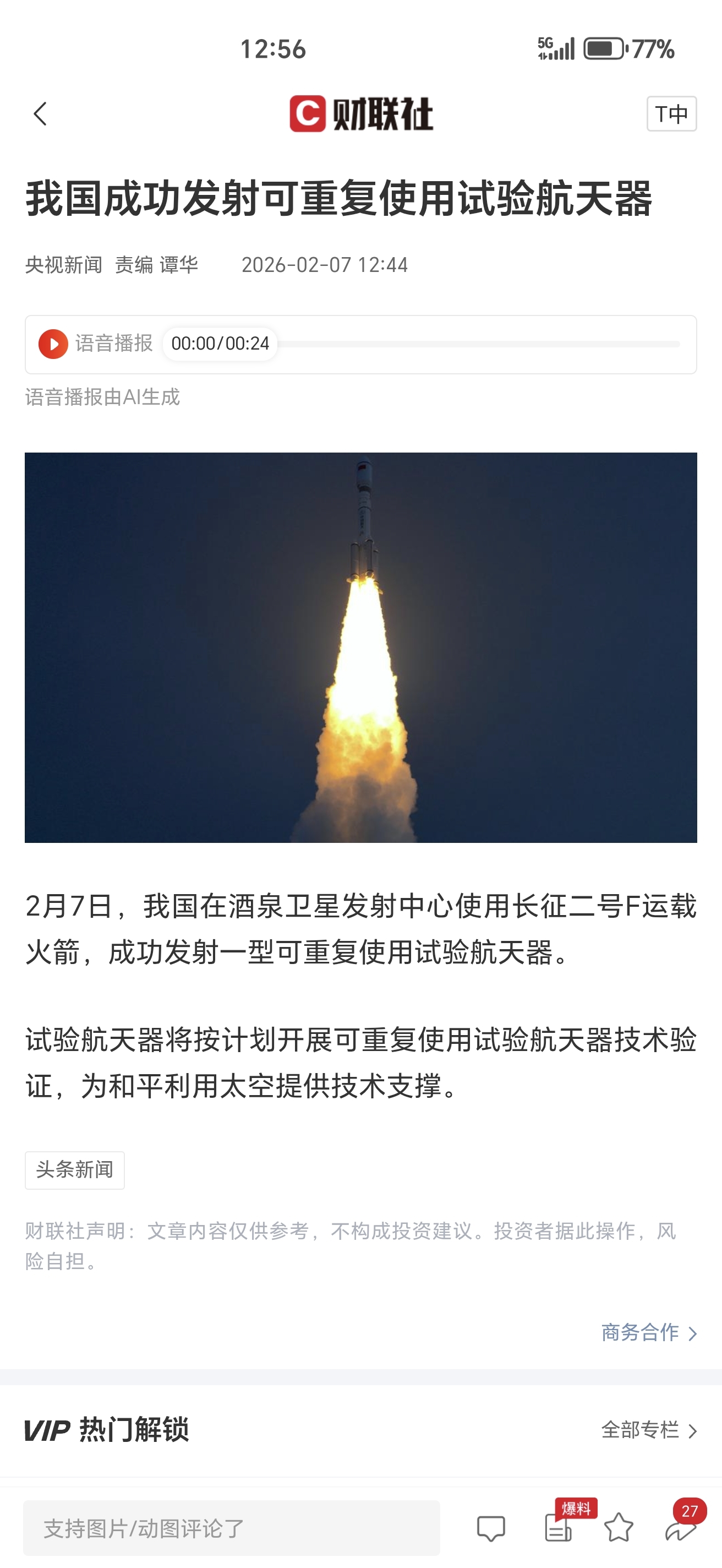 我国成功发射可重复使用试验航天器央视新闻责编谭华2026-02-0712:44