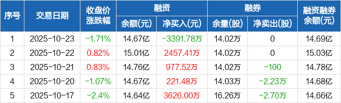 海亮股份:融资净偿还3391.78万元,融资余额14.67亿元(10-23)