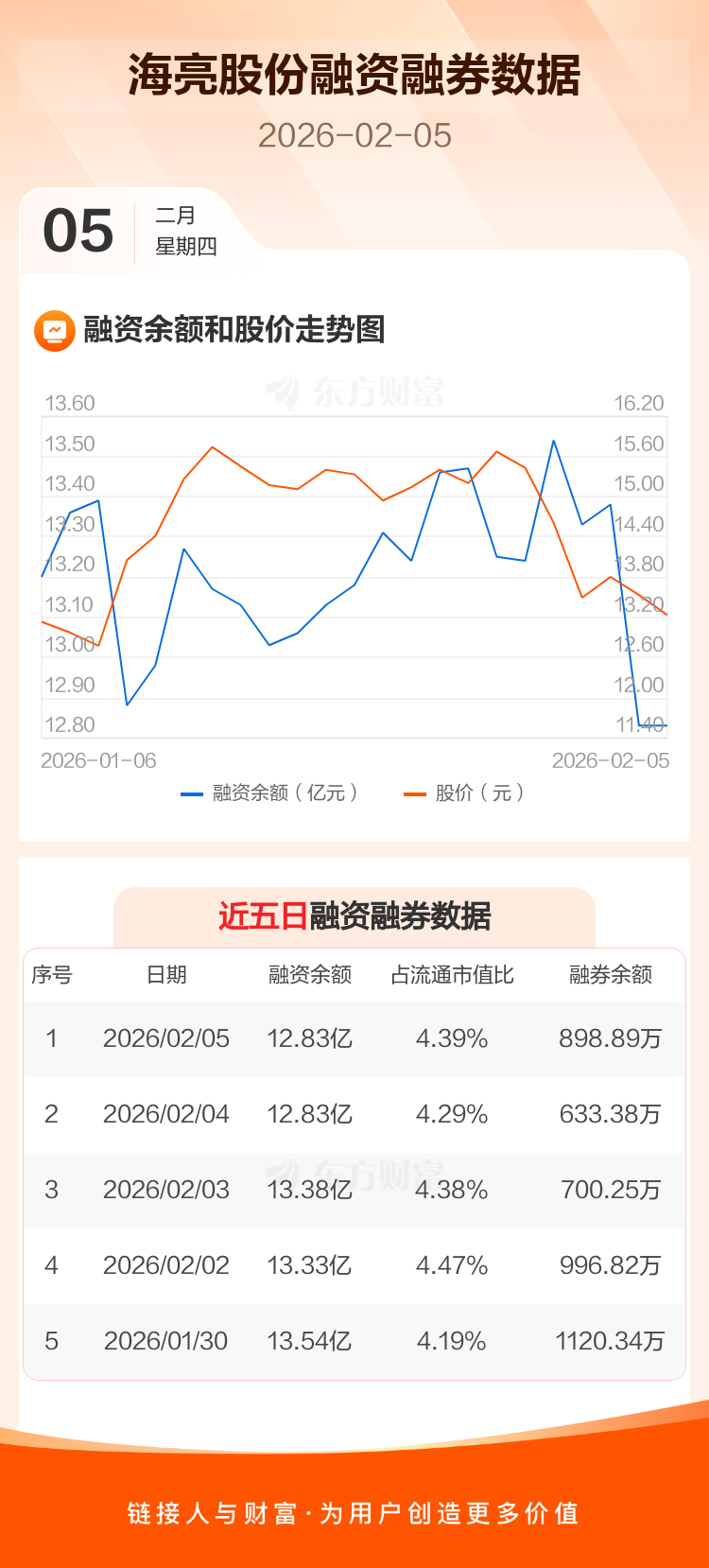交易所最新数据显示,海亮股份于2026年2月5日获融资买入2239.51万元,融资偿还2244.87万元,当日融资净偿还5.36万元。目前,该股融资余额12.83亿,占流通市值比例为4.39%。